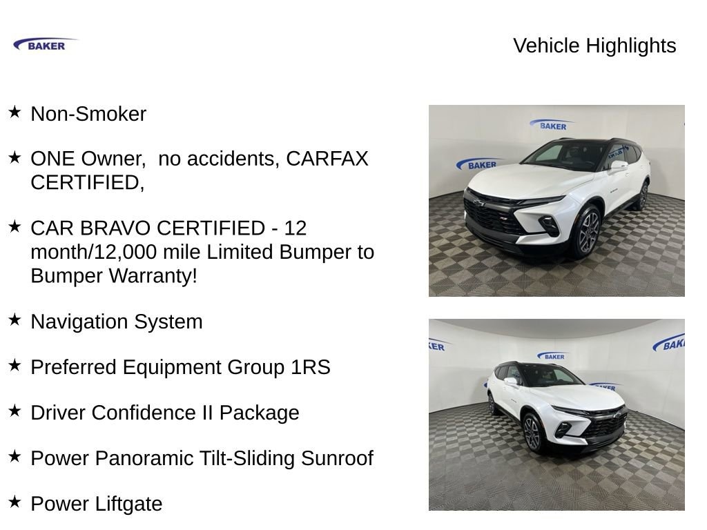 New Price! Iridescent Pearl Tricoat 2023 Chevrolet Blazer RS AWD 9-Speed Automatic with Overdrive 3.6L V6 SIDI Non-Smoker, ONE Owner, no accidents, CARFAX CERTIFIED,, CAR BRAVO CERTIFIED - 12 month/12,000 mile Limited Bumper to Bumper Warranty!, Blazer RS, 4D Sport Utility, 3.6L V6 SIDI, AWD, Iridescent Pearl Tricoat, Jet Black/Nightshift Blue Leather, Adaptive Cruise Control, Driver Confidence II Package, Enhanced Automatic Emergency Braking, HD Surround Vision, Heated Driver & Front Passenger Seats, Heated Steering Wheel, Navigation System, Perforated Leather-Appointed Seat Trim, Power Liftgate, Power Panoramic Tilt-Sliding Sunroof, Preferred Equipment Group 1RS, Rear Camera Mirror, Rear Park Assist w/Audible Warning, Safety Alert Seat, Wheels: 20 Technical Gray Aluminum.
