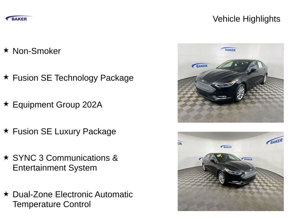 Shadow Black 2017 Ford Fusion SE FWD 6-Speed Automatic 1.5L EcoBoost Non-Smoker, 4D Sedan, 1.5L EcoBoost, FWD, Shadow Black, Ebony, Dual-Zone Electronic Automatic Temperature Control, Equipment Group 202A, Fusion SE Luxury Package, Fusion SE Technology Package, SYNC 3 Communications & Entertainment System.