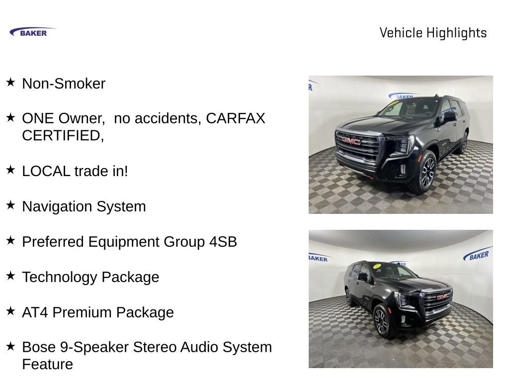 New Price! Certified. Onyx Black 2024 GMC Yukon AT4 4WD 10-Speed Automatic with Overdrive EcoTec3 6.2L V8 Non-Smoker, ONE Owner, no accidents, CARFAX CERTIFIED,, LOCAL trade in!, Yukon AT4, 4D Sport Utility, EcoTec3 6.2L V8, 4WD, Onyx Black, Black Leather, 12-Way Power Seat Adjusters, 15 Diagonal Multi-Color Head-Up Display, 2 Presets For Outside Rearview Mirrors, 3rd Row 60/40 Power-Folding Split-Bench Seat, AT4 Premium Package, Black Roof-Mounted Luggage Rack Side Rails, Bose 9-Speaker Stereo Audio System Feature, Bright Front & Rear Door Sill Plates, Dual-Pane Panoramic Power Sunroof, Front High-Approach Angle Fascia, Hands-Free Power Programmable Rear Liftgate, Heated 2nd Row Outboard Position Seats, Heated Driver & Front Passenger Seats, Heated Steering Wheel, Heavy-Duty Air Filter, Hill Descent Control, Inside Rear-View Auto-Dimming Mirror, Navigation System, Outside Heated Power-Adjustable Mirrors, Perforated Heated & Ventilated Dr & Frt Pass Seats, Power Liftgate, Power Release 2nd Row 60/40 Split-Folding Bench Seat, Power Tilt & Telescopic Steering Column, Power-Retractable Assist Steps, Preferred Equipment Group 4SB, Red Horizontal-Mounted Recovery Hooks, Safety Alert Seat, Technology Package, Universal Home Remote, Wheels: 20 x 9 6-Spoke Machined Aluminum, Wireless Charging.