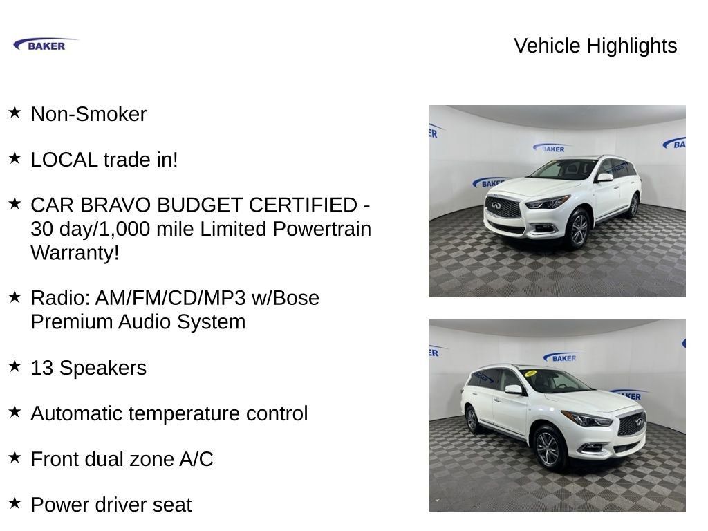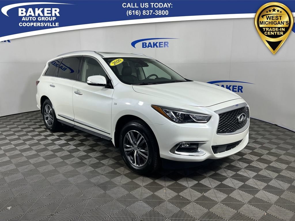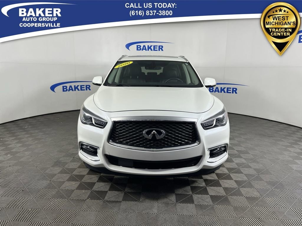 New Price! Majestic White 2020 INFINITI QX60 LUXE AWD CVT 3.5L V6 Non-Smoker, LOCAL trade in!, CAR BRAVO BUDGET CERTIFIED - 30 day/1,000 mile Limited Powertrain Warranty!, QX60 LUXE, 3.5L V6, CVT, AWD, Majestic White, Graphite Artificial Leather, 13 Speakers, Automatic temperature control, Blind Spot Warning, Front dual zone A/C, Heated Front Seats, Heated steering wheel, Memory seat, Power driver seat, Power Liftgate, Power moonroof, Power passenger seat, Radio: AM/FM/CD/MP3 w/Bose Premium Audio System, Reclining 3rd row seat, Wheels: 18 Triple 5-Spoke Aluminum-Alloy.