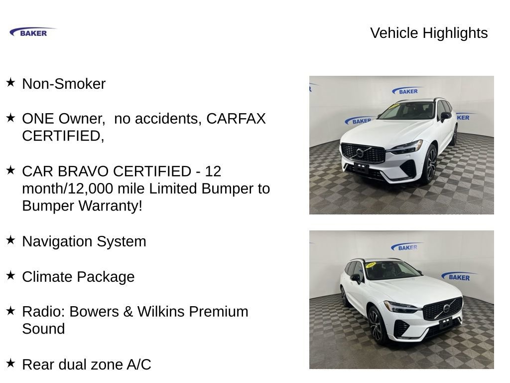 New Price! Crystal White Metallic 2023 Volvo XC60 B6 Ultimate Dark Theme AWD Automatic with Geartronic 2.0L I4 Non-Smoker, ONE Owner, no accidents, CARFAX CERTIFIED,, CAR BRAVO CERTIFIED - 12 month/12,000 mile Limited Bumper to Bumper Warranty!, 4D Sport Utility, 2.0L I4, AWD, Crystal White Metallic, Charcoal w/Leather Upholstery, Air Conditioning, Climate Package, Exterior Parking Camera Rear, Front dual zone A/C, Heads-Up Display, Heated front seats, Heated Rear Seats, Heated Steering Wheel, Memory seat, Navigation System, Perforated Nappa Leather Upholstery, Power driver seat, Power moonroof, Power Operated Tailgate, Power passenger seat, Radio: Bowers & Wilkins Premium Sound, Rear dual zone A/C, Ventilated front seats, Wheels: 20 5-Y Spoke Black Diamond Cut Alloy.