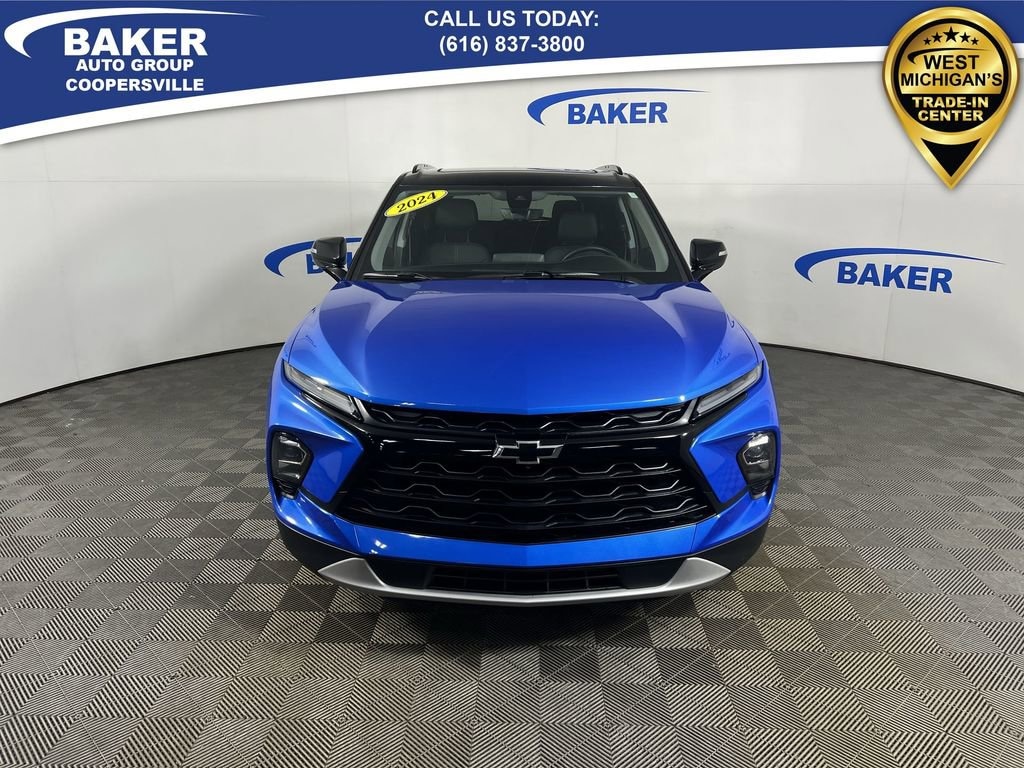 Riptide Blue Metallic 2024 Chevrolet Blazer LT AWD 9-Speed Automatic with Overdrive 3.6L V6 SIDI Non-Smoker, ONE Owner, no accidents, CARFAX CERTIFIED,, CAR BRAVO CERTIFIED - 12 month/12,000 mile Limited Bumper to Bumper Warranty!, Blazer LT, 4D Sport Utility, 3.6L V6 SIDI, AWD, Riptide Blue Metallic, Jet Black Leather, 120-Volt Power Outlet, 1st & 2nd Row All-Weather Floor Liners (LPO), 2 USB Data Ports w/SD Card Reader, 6-Way Power Front Passenger Seat Adjuster, Adaptive Cruise Control, Black Roof-Mounted Side Rails, Driver Confidence Package, Enhanced Automatic Emergency Braking, Floor Liner Package (LPO), Front & Rear Black Bowties, HD Surround Vision, Heated front seats, Inside Rear-View Auto-Dimming Mirror, Integrated Cargo Liner (LPO), Lane Change Alert w/Side Blind Zone Alert, Midnight/Sport Edition, Outside Heated Power-Adjustable Body-Color Mirrors, Power Liftgate, Power Panoramic Tilt-Sliding Sunroof, Preferred Equipment Group 3LT, Radio: Chevrolet Infotainment 3 Premium System, Rear Cross Traffic Alert, Rear Park Assist w/Audible Warning, Rear Power Programmable Liftgate, Sound & Technology Package, Universal Home Remote, Wheels: 18 High Gloss Black Painted Aluminum, Wireless Charging.